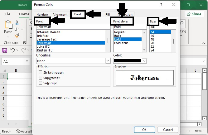 單擊“格式”後,將彈出一個對話方塊,在其中選擇“字型”,在字型選項卡下選擇所需的樣式和大小,如下所示。