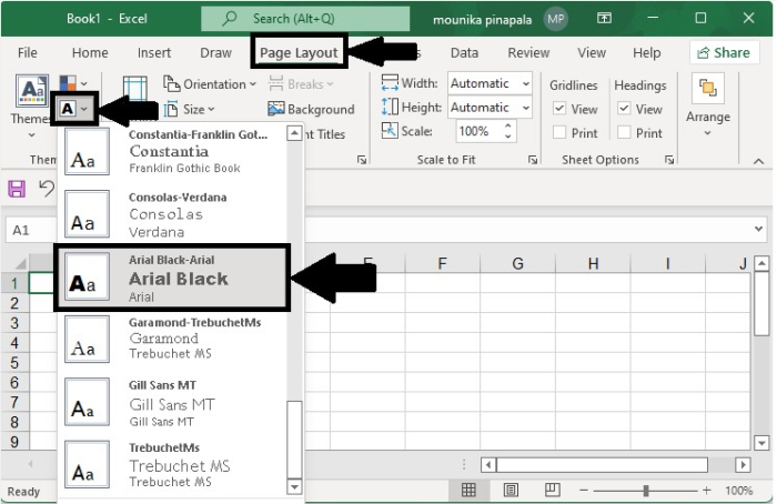 開啟 Excel 表格,轉到“頁面佈局”,轉到“主題”組,在其中選擇“字型”,然後從下拉列表中選擇您喜歡的字型之一。您將在 Excel 工作簿中觀察到行和列標題的字型變化。