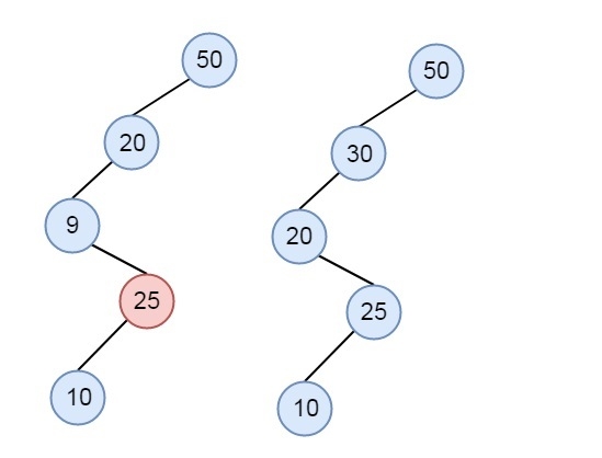 我們有一個數組 A,我們必須檢查該陣列是否可以表示具有 n 層的 BST。由於層級是,我們可以按照以下方式構建樹。假設一個數字是 k,大於 k 的值移動到右側,小於 k 的值移動到左側。假設有兩個列表:{50, 20, 9, 25, 10} 和 {50, 30, 20, 25, 10}