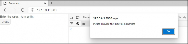 如果你提供除數字外的任何值,則會收到一條警報訊息。這將產生以下輸出:-