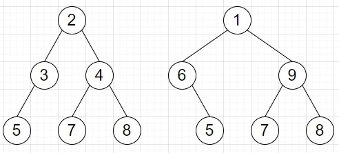 root1 = TreeNode(2) root1.left = TreeNode(3) root1.right = TreeNode(4) root1.left.left = TreeNode(5) root1.right.left = TreeNode(7) root1.right.right = TreeNode(8) root2 = TreeNode(1) root2.left = TreeNode(6) root2.right = TreeNode(9) root2.left.right = TreeNode(5) root2.right.left = TreeNode(7) root2.right.right = TreeNode(8)