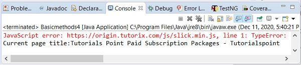 import org.openqa.selenium.By; import org.openqa.selenium.WebDriver; import org.openqa.selenium.WebElement; import org.openqa.selenium.chrome.ChromeDriver; import java.util.concurrent.TimeUnit; import org.openqa.selenium.support.ui.ExpectedConditions; import org.openqa.selenium.support.ui.WebDriverWait; public class ElemntClickable{ public static void main(String[] args) { System.setProperty("webdriver.chrome.driver", "C:\Users\ghs6kor\Desktop\Java\chromedriver.exe"); WebDriver driver = new ChromeDriver(); //implicit wait driver.manage().timeouts().implicitlyWait(5, TimeUnit.SECONDS); //URL launch driver.get("https://tutorialspoint.tw/index.htm"); WebElement n=driver.findElement(By.className("mui-btn")); n.click(); // explicit wait WebDriverWait wt = new WebDriverWait(driver,6); // elementToBeClickable expected criteria wt.until(ExpectedConditions.elementToBeClickable (By.className("s-buy"))); System.out.println("Current page title:" + driver.getTitle()); driver.close(); } }