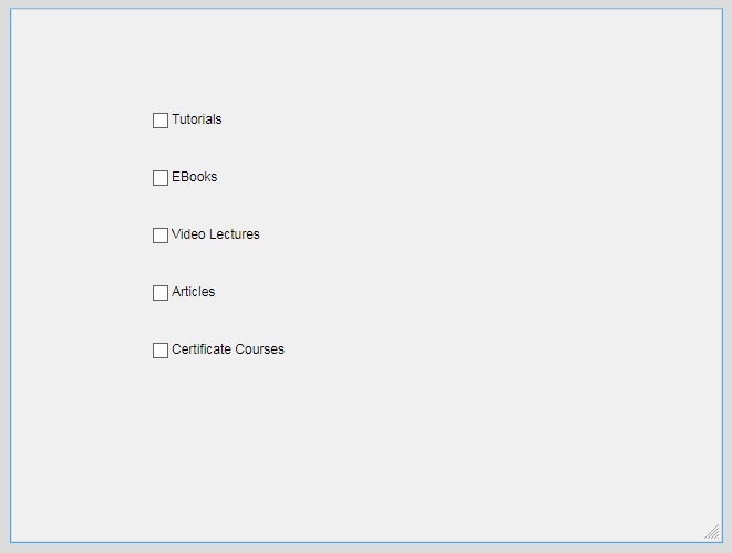步驟 1 - 建立五個帶有標籤“教程”、“電子書”、“影片講座”、“文章”和“證書課程”的複選框。