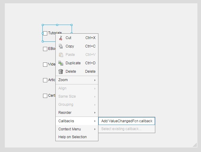 步驟 2 - 現在,編寫 MATLAB 程式碼為每個複選框新增功能。為此,右鍵單擊第一個複選框“教程”,然後單擊“回撥”選項,然後選擇“新增 ValueChangedFcn 回撥”選項。