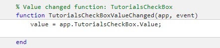 單擊“新增 ValueChangedFcn 回撥”選項後,它將帶我們進入程式碼視窗,在該視窗中它新增一個名為“TutorialsCheckBoxValueChanged()”的函式。