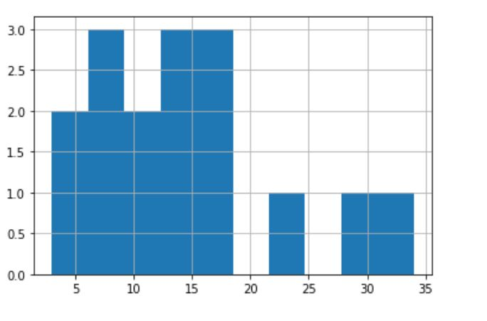 import pandas as pd df = pd.Series([11,12,13,14,15,16,17,18,8,3,5,7,9,23,30,34]) df.hist()