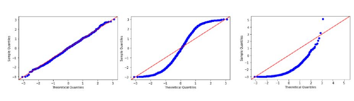 為了使資料或特徵遵循正態分佈,它應該更緊密地與上圖中的紅線對齊。在最左邊的影像中,我們可以說它遵循正態分佈,因為實際分位數與理論分位數一致。