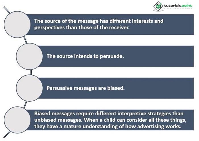 電視上的廣告旨在讓人們以某種方式思考和行動。當成年人將特定資訊識別為廣告時,他們的認知過濾器或防禦機制就會被啟用。這些過濾器會考慮以下因素 -