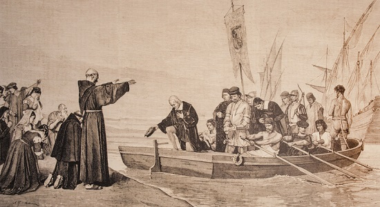 克里斯托弗·哥倫布從帕洛斯啟航。取材於安東尼奧·吉斯伯特繪畫的版畫。西班牙特魯希略探險家遊客中心