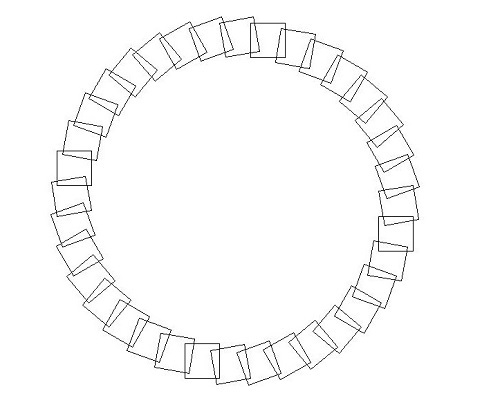 import turtle t = turtle.Turtle() t.speed('fastest') t.penup() t.goto(0, 250) t.pendown() radius = 45 angle = 10 for i in range(36): for j in range(4): t.forward(50) t.right(90) t.penup() t.right(angle) t.forward(radius) t.pendown() t.hideturtle() turtle.done()