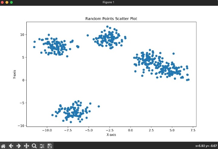 from sklearn.datasets import make_blobs import matplotlib.pyplot as plt # Generate random points features, targets = make_blobs(n_samples=500, centers=5, random_state=42, shuffle=False) # Create the scatter plot plt.scatter(features[:, 0], features[:, 1]) # Customize plot appearance plt.title("Random Points Scatter Plot") plt.xlabel("X-axis") plt.ylabel("Y-axis") # Display the plot plt.show()