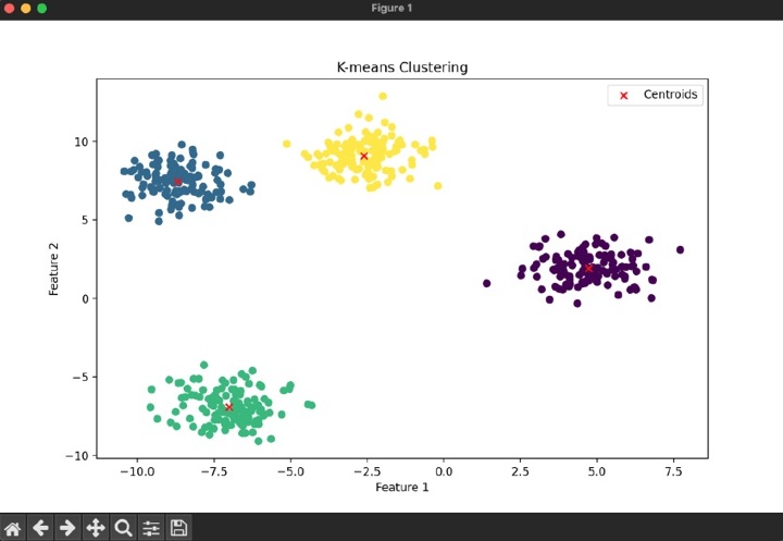 import matplotlib.pyplot as plt from sklearn.cluster import KMeans from sklearn.datasets import make_blobs from sklearn.metrics import silhouette_score, calinski_harabasz_score, davies_bouldin_score # Generate sample data X, y_true = make_blobs(n_samples=500, centers=4, random_state=42) # Perform clustering using k-means algorithm kmeans = KMeans(n_clusters=4, random_state=42) y_pred = kmeans.fit_predict(X) # Evaluate clustering performance using metrics silhouette = silhouette_score(X, y_pred) calinski_harabasz = calinski_harabasz_score(X, y_pred) davies_bouldin = davies_bouldin_score(X, y_pred) # Plot the clustering results plt.scatter(X[:, 0], X[:, 1], c=y_pred) plt.scatter(kmeans.cluster_centers_[:, 0], kmeans.cluster_centers_[:, 1], marker='x', c='red', label='Centroids') plt.title('K-means Clustering') plt.xlabel('Feature 1') plt.ylabel('Feature 2') plt.legend() plt.show() # Print the evaluation scores print(f"Silhouette Score: {silhouette:.3f}") print(f"Calinski-Harabasz Index: {calinski_harabasz:.3f}") print(f"Davies-Bouldin Index: {davies_bouldin:.3f}")