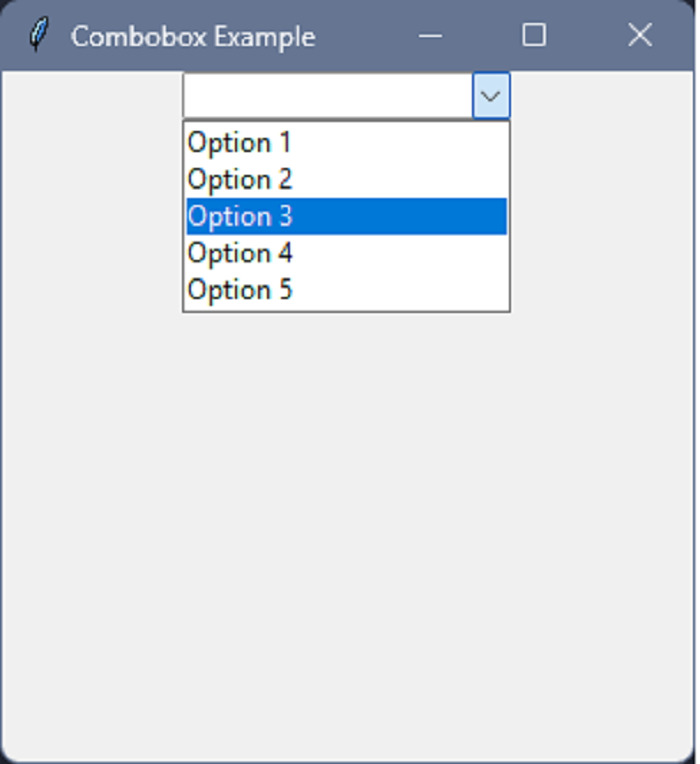 from tkinter import * from tkinter import ttk root = Tk() root.title("Combobox Example") root.geometry('300x300') combo = ttk.Combobox(root, values=["Option 1", "Option 2", "Option 3", "Option 4", "Option 5"]) combo.pack() def option_selected(event): selected_option = combo.get() print("You selected:", selected_option) combo.bind("<<ComboboxSelected>>", option_selected) root.mainloop()