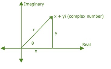 對於複數,r表示絕對值或模,角度θ稱為複數的幅角,$\mathrm{r\:=\:\lvert\:Z\:\rvert\:=\:\sqrt{x^{2}\:+\:y^{2}}}$