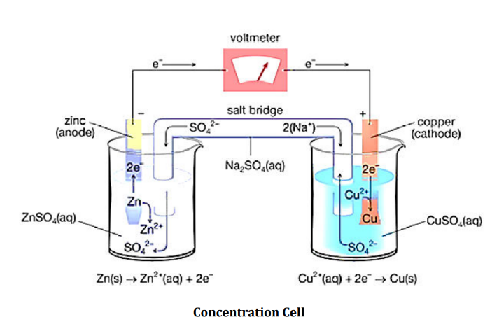 濃差電池由兩個具有相同電極但電解質濃度不同的半電池組成。這種濃差電池的工作原理取決於維持兩個電池濃度之間的平衡。它相應地濃縮更稀的溶液。透過轉移電子,它實現了兩個半電池之間的平衡。電子將從低濃度半電池轉移到高濃度半電池。電池的電動勢可以按如下方式計算: