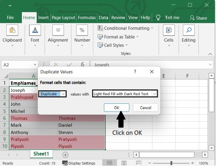 單擊“確定”後,我們可以看到重複值已用淺紅色和深紅色文字突出顯示。