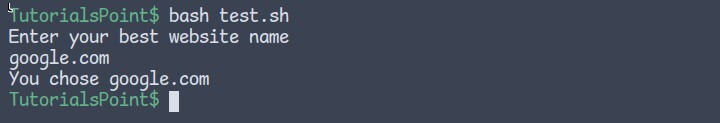 #!/bin/bash echo "Enter your best website name" read name if [[ $name == "tutorialspoint" ]] then echo "You are Right; the best website is Tutorialspoint" elif [[ $name == "google" ]] then echo "Your best website is Google" else echo "You chose $name" fi exit 0