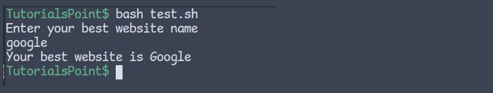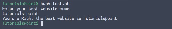 #!/bin/bash echo "Enter your best website name" read name if [[ $name == "tutorialspoint" ]] then echo "You are Right; the best website is Tutorialspoint" fi exit 0