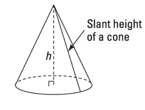 $\mathrm{圓錐的斜高(l)\:等於\:l\:=\:\sqrt{h^{2}\:+\:r^{2}}}$