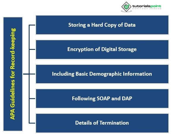 治療師有法律和倫理責任維護其客戶的準確和機密記錄。這意味著記錄應儲存在安全的地方,並且只能由授權人員訪問。此外,治療師在與其他專業人士共享客戶資訊時,應使用安全通訊方法,例如加密電子郵件或訊息。美國心理學會為私人從業人員提供了關於記錄儲存的廣泛指南。下面討論了一些要點 -