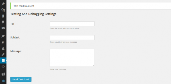 在下方,我們可以找到測試和除錯設定。此部分由外掛提供,用於測試電子郵件的傳送和接收。以下螢幕截圖顯示了相同的內容,只需輸入值並單擊傳送測試電子郵件:−