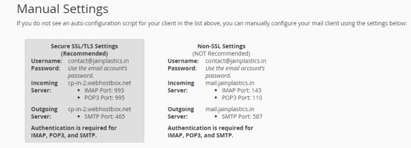 現在我們將看到“contact@jainplastics.in 的郵件客戶端配置”視窗將開啟。在手動設定下,選擇安全 SSL/TLS 設定。以下是顯示詳細資訊的螢幕截圖:−