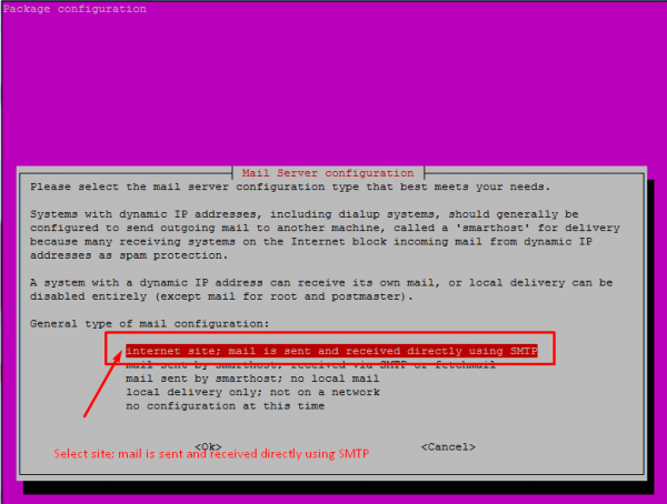 選擇 **“internet site; mail is sent and received directly using SMTP”** 選項