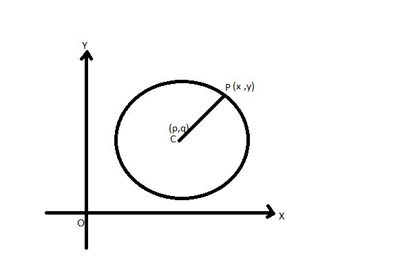 考慮一個圓心為 (p, q),圓上有一點 P (x, y) 的圓。圓的半徑為 r。