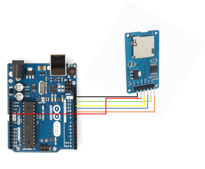 只有對於Vcc,請確保您的SD卡座輸入電壓為5V。如果輸入電壓為3.3V,請將其連線到Arduino Uno上的3.3V引腳。
