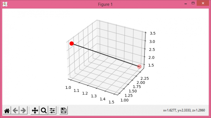 from matplotlib import pyplot as plt plt.rcParams["figure.figsize"] = [7.50, 3.50] plt.rcParams["figure.autolayout"] = True fig = plt.figure() ax = fig.add_subplot(projection="3d") x, y, z = [1, 1.5], [1, 2.4], [3.4, 1.4] ax.scatter(x, y, z, c='red', s=100) ax.plot(x, y, z, color='black') plt.show()
