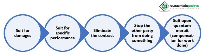 發生合同違約時,受影響的一方可以向法院要求恢復,法院可以命令另一方履行承諾。在合同違約中,有許多型別的損害需要考慮。損害賠償訴訟、強制履行訴訟、解除合同、阻止對方採取任何行動以及基於受益的訴訟都是合同違約的補救措施(已完成工作的補償)。