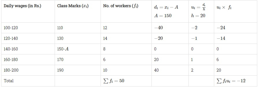 - 考慮一家工廠50名工人的日工資分佈。日工資(盧比):100-120 120-140 140-160 160-180 180-200 工人人數:12 14 8 6 10 使用適當的方法計算工廠工人的平均日工資。