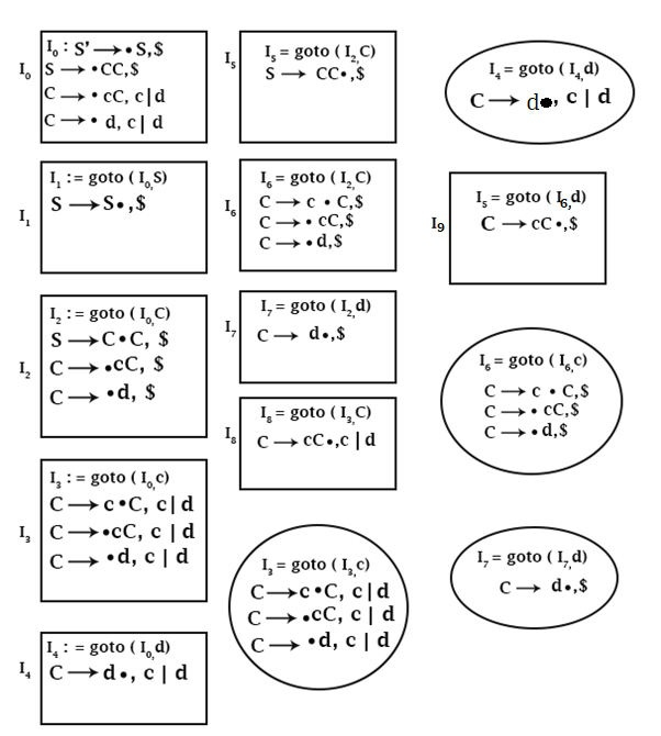 步驟1 − 構造 LR(1) 專案集。首先,應生成所有 LR(1) 專案集。