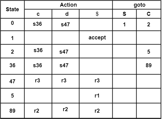 LALR 解析表也可以透過合併 CLR 解析的組合狀態的行來獲得,即合併對應於 3、6 的行,然後是 4、7,然後是 8、9。