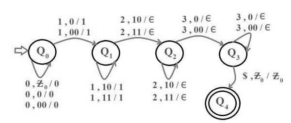 - Δ 是轉移函式:Q × (Σ ∪ {e}) × S → Q × S*