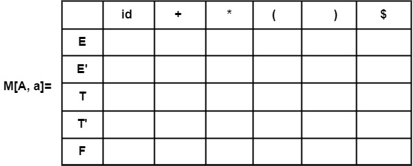 將所有語句 (1) 到 (8) 組合起來將生成以下預測或 LL (1) 分析表 -