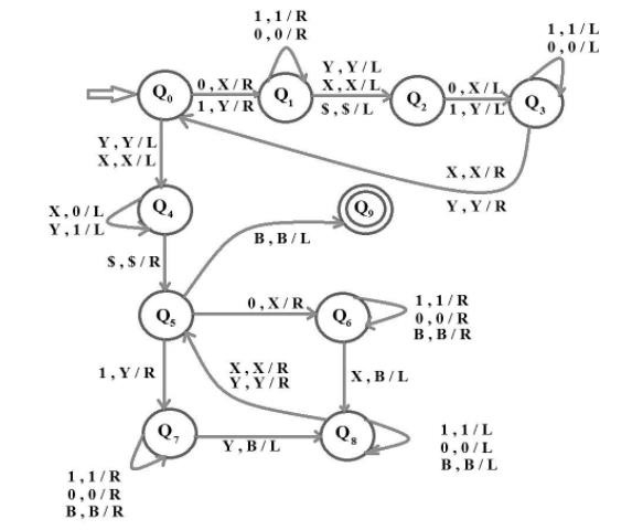 使用圖靈機 (TM) 實現相同的功能如下所示: