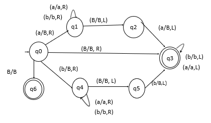 對於偶長度迴文串,在機器執行並擦除第一個和最後一個元素且沒有遇到不匹配後,定義了一個 TM。之後,圖靈機接受該字串,該字串是偶長度迴文串。