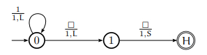 (2): (0, , 1, L, 1) 在單元格中寫入1並向左移動。