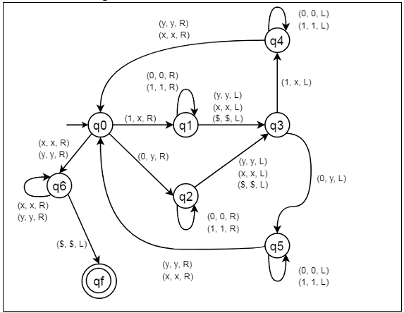 在這裡,我們將瞭解如何為語言 L = {WWr |W 屬於 {0, 1}} 構建圖靈機。所以這表示一種語言,我們只使用兩個字元 0 和 1。w 是一個字串,wr 是它的逆序。所以如果 w = 10110,那麼 wr 將是 01101。因此,圖靈機將接受字串 z = 1011001101。
