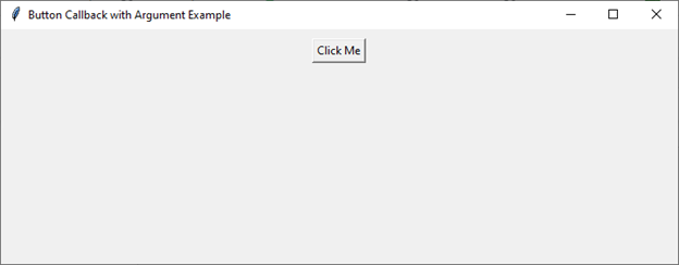import tkinter as tk def on_button_click(): print("Button clicked!") # Creating the main application window root = tk.Tk() root.title("Button Callback Example") root.geometry("720x250") # Creating a button and associating the on_button_click function with its command button = tk.Button(root, text="Click Me", command=on_button_click) button.pack(pady=10) # Running the Tkinter event loop root.mainloop()