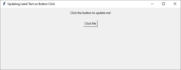 import tkinter as tk def update_label_text(): new_text = "Button clicked!" label.config(text=new_text) root = tk.Tk() root.title("Updating Label Text on Button Click") root.geometry("720x250") # Creating a label with initial text label = tk.Label(root, text="Click the button to update me!") label.pack(pady=10) # Creating a button to trigger the update button = tk.Button(root, text="Click Me", command=update_label_text) button.pack(pady=10) root.mainloop()