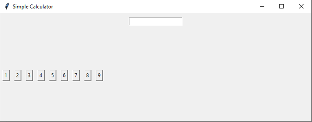 import tkinter as tk def update_entry_text(number): current_text = entry.get() new_text = current_text + str(number) entry.delete(0, tk.END) entry.insert(0, new_text) root = tk.Tk() root.title("Simple Calculator") root.geometry("720x250") # Creating an entry widget for displaying input entry = tk.Entry(root, width=20) entry.pack(pady=10) # Creating number buttons and associating them with update_entry_text callback for i in range(1, 10): button = tk.Button(root, text=str(i), command=lambda i=i: update_entry_text(i)) button.pack(side=tk.LEFT, padx=5) root.mainloop()