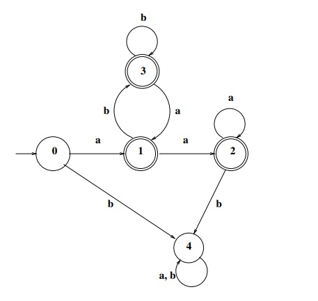 給定構造確定有限自動機 (DFA) 的語言是,字母表 ∑={a,b},字串以“a”開頭但不包含子串“aab”。