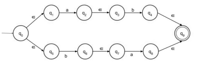 該語言由字串 ab 或 ba 組成,可以寫成 (ab + ba)。因此,最終的 ε-NFA 有兩條路徑,一條路徑用於 ab,另一條路徑用於 ba,兩者都進入終結狀態。