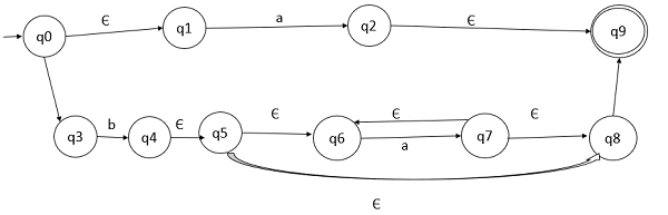 上圖為給定正則表示式 a+ba* 的最終 NFA 帶轉換。