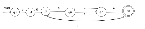 q3 輸入 'b' 後進入 q4,q4 透過 epsilon 轉換到 q5,q5 透過 epsilon 轉換到 q6,q6 輸入 'a' 後進入 q7,而 q7 透過 epsilon 轉換到 q6 和 q8。