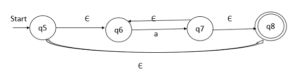 q5 透過 epsilon 轉換到 q6 和 q8,q6 透過 'a' 轉換到 q7,而 q7 透過 epsilon 轉換到 q6 和 q7。
