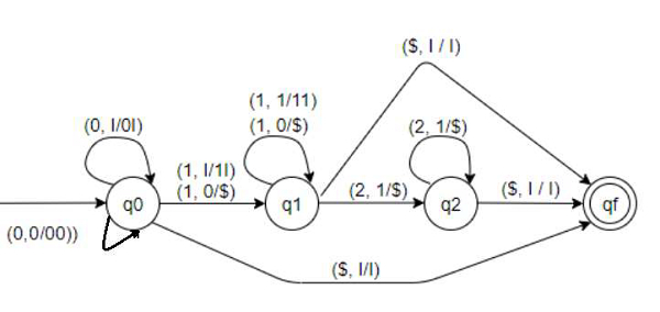 ( 2, 1/$ ) - 如果堆疊頂部為1且當前輸入符號為2,則彈出1並移動到q2。