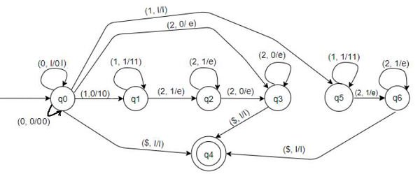 我們得到了一種語言“L”,任務是為該語言構建一個下推自動機,這說明2的出現次數將是0和1出現次數的和,並且0和1的出現次數至少為一,也可以使字串為空,並且應該被自動機接受。